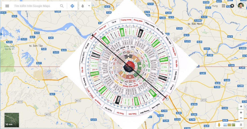 Mộ Bố cái Đại Vương - Phùng Hưng có hướng : 315 độ - Tọa Tốn - Hướng Càn - Tây Bắc - Phân kim : Tân Tị - Đinh Hợi là Huyệt khí bảo châu ." Đinh Hợi khí ở chính Kiền long thì đại phát phú quý, được nhiều sự cát khánh, ứng vào các năm Thân, Tý, Thìn; chỉ sợ Tốn thủy phương xung thì quan tài đầy bùn nước mục nát, tối hung. "