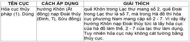 Cách dùng: thế đất có thủy lai đáo sơn Càn hoặc sơn Giáp thì nên lập mộ hướng theo thủy cục tam hợp (theo công thức bát quái nạp giáp tam hợp): Tý - Quý - Thân - Thìn.