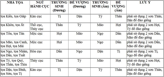 Pháp thức này dựa vào công thức "Thập nhị thần" để lấy hai cung Trường sinh và Đế vượng dùng để đào giếng. Muốn sử dụng cho đúng pháp này thì cần phải phân biệt nhà thuộc dương cục hay thuộc âm cục - thì phải biết xem "lai long" phương nào tới (như đã nói trong mục "Âm Dương"). Tuy nhiên, theo thực trạng hoàn cảnh xã hội ngày nay thì phố xá nhà cửa quá đông - khó lòng xác định chính xác lai long. Do vậy chỉ nên dùng hai cung đế vượng của hai cục âm dương mà thôi, chứ không nên dùng hai cung Trường sinh (bởi nếu dùng lộn thì sinh sẽ thành tử, tử sẽ thành sinh rất là nguy hiểm). Các sơn được gộp chung bởi pháp "Bát quái nạp giáp tam hợp", được chia thành tám cục như sau: