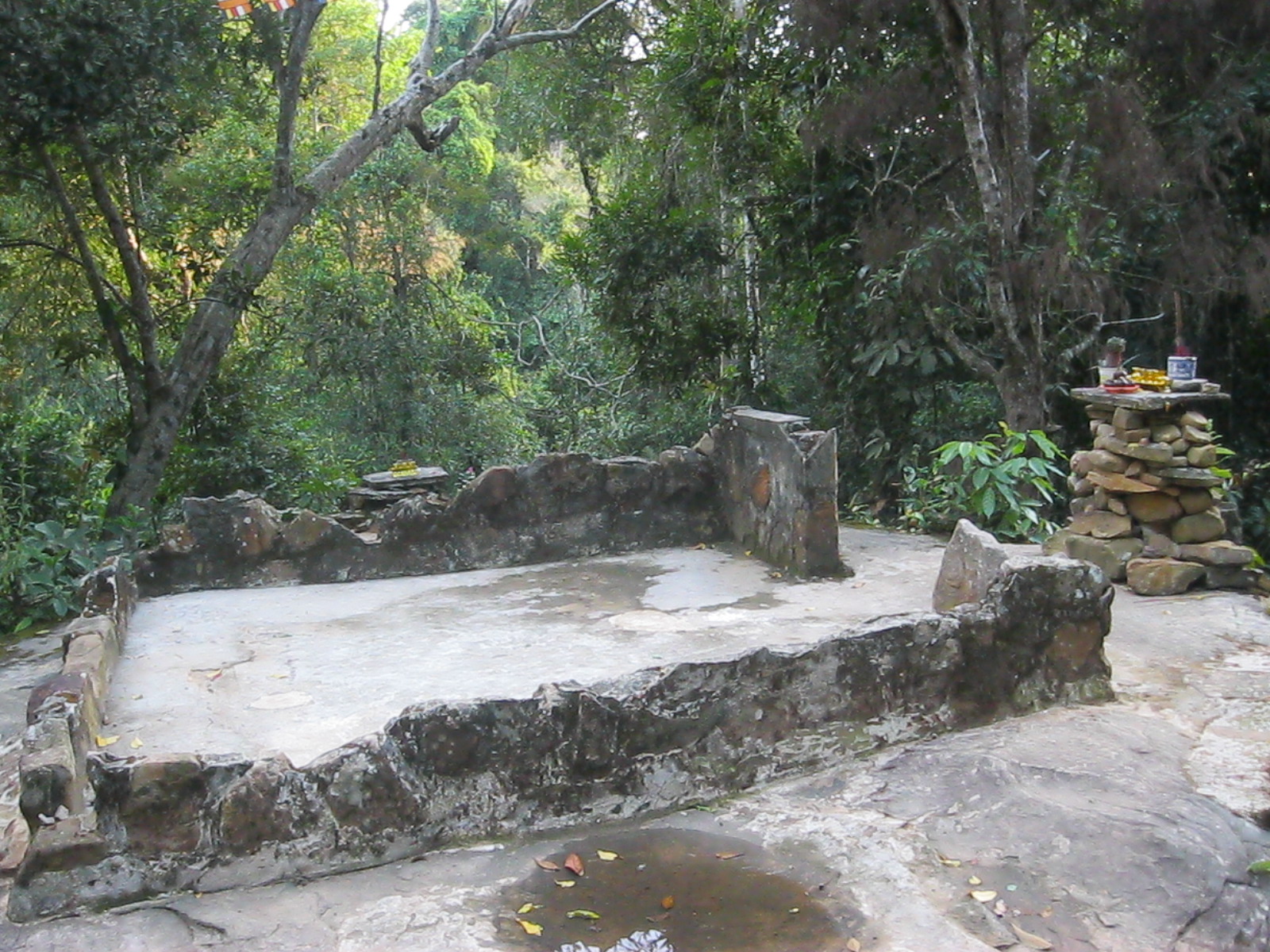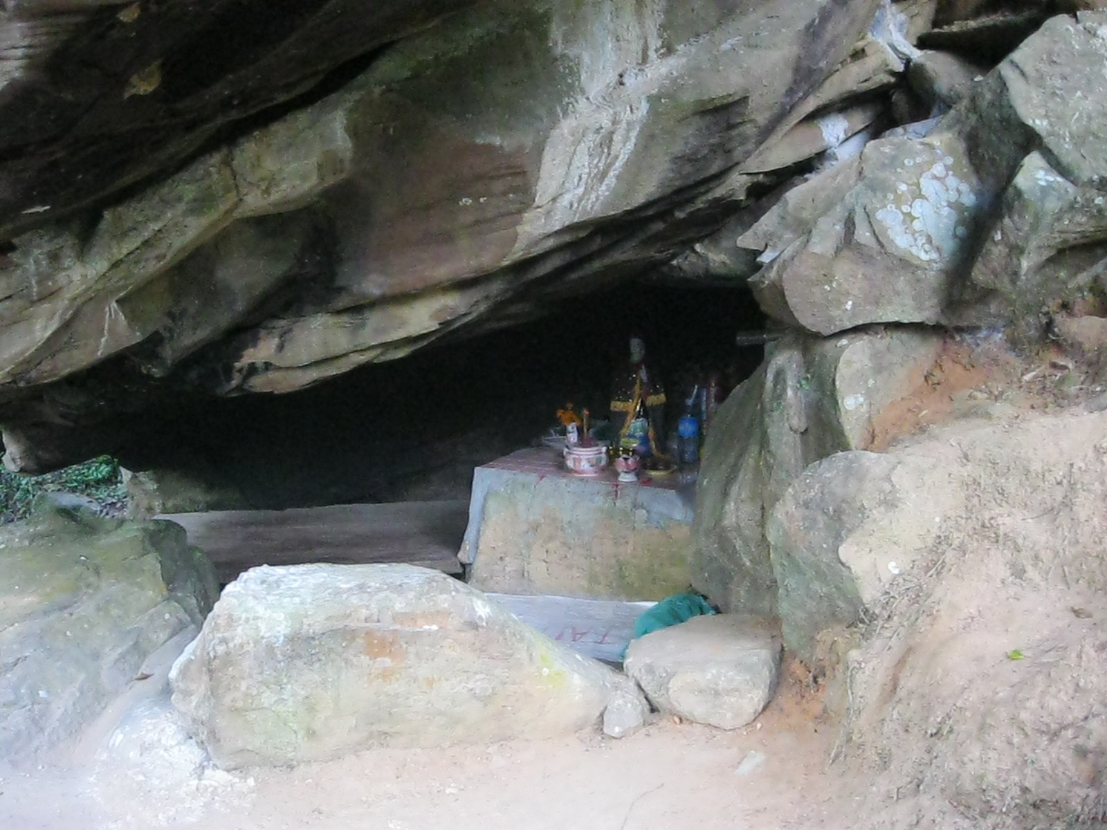 Nhận ra tôi là đồng hương, lại có "tín vật" đồng môn, ông Vang vui vẻ bắt chuyện. Ông Vang đưa tôi trở lại "kham maya kul" tức quần thể hang động luyện phép thuật. Chúng tôi vạch lá, len khe đá để đi mất nửa giờ đồng hồ mới đến nơi.